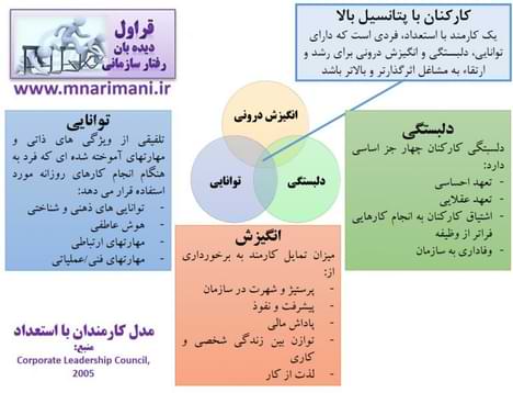 ازاينروست كه برای مخاطب فارسیزبان، هنگامیکه از مديريت استعدادها صحبت میشود، معنای تبديل قابليت بالقوه به بالفعل به ذهن متبادر میگردد درحالیکه مديريت استعدادها با اين امر متفاوت است. اما بالاخره منظور از استعداد در اين حوزه از مديريت منابع انسانی چيست؟ در بین تعارف مختلف شاید تعریف CLC (Corporate Leadership Council) از کارمند با استعداد شفاف و گویا باشد: کارکنان با پتانسیل بالا يک کارمند با استعداد، فردی است که دارای توانایی (Ability) احساس تعهد(Engagement) و انگيزش درونی برای رشد و ارتقاء (Aspiration to Rise and Succeed) به مشاغل اثرگذارتر و بالاتر باشد. مدل شايستگیهای بالقوه بهدست آمده در اين تحقيق به صورت زير ترسيم شده است: هر کاری قرار است شروع شود، اولین قدم، اجماع ذینفعان در مورد مفاهیم اصلی است. اگر اقدامی درخصوص مدیریت استعداد قرار است شروع کنید، قبل از هر اقدامی، روی تعریف اجماع ایجاد کنید. شاید مدل فوق و مدلهای اینچنینی کمککننده باشد.