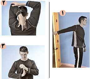 حركت دوم: یكی از دستها را بالای سر برده و آرنج خود را خم كنید تا انگشتان شما به پشت سرتان در فاصله بین كتفها برسند. با استفاده از دست مخالف سمت خارجی آرنج را گرفته و بكشید تا كشش را در پشت بازو یعنی محل قرارگیری عضله 3 سر احساس كنید. 30 ثانیه در این حالت بمانید. این حركت را 5 بار برای هر دست تكرار كنید. حركت سوم: این حركت كششی ساده برای به آرامش درآوردن عضلات ساعد، بسیار مفید است. كافی است با یكی از دستهای خود انگشتان دست دیگر را به سمت عقب فشار دهید. با انجام این حركت باید بتوانید كشش را در جلوی ساعد احساس كنید. 30 ثانیه حالت كشش را حفظ كنید. این حركت را 5 بار برای هر دست انجام دهید.