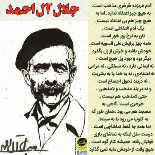 گزیدهای از سخنان جلال آلاحمد "حیف، حیف که این تن بدهکار است. فکر میکردم اگر این تن، بدهکار نبود؛ بدهکار این همه نعماتی که حرام میکند، چه راحت میشد کنارنشست و تماشاچی بود و خیالبافت و به شعر و عرفان پناهبرد. اما حیف که جبران این همه نعمت، به سکون، ممکن نیست ... جبران هرکدام از این نعمات را باید به عمل کرد، نه به سکون؛ سکون و سکوت جبران هیچ چیزی را نمیکند ... وقتی از جایت تکان نخوردی، کمترین نتیجهاش این است که نجیب میمانی مثل پیرزنها!"