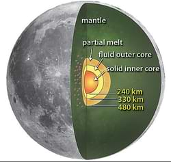 ساختار درونی ماه از هستهای بسیار کوچک، که تنها یک تا دودرصد از جرم کلی ماه را تشکیل میدهد، برخوردار و وسعت آن ۶۸۰ کیلومتر است. بخش غالب این هسته از آهن تشکیل شده، اما مقادیر زیادی سولفور و دیگر عناصر نیز در آن وجود دارد. پوسته سنگی ماه ضخامتی برابر هزار و ۳۳۰ کیلومتر دارد از از سنگهای متراکم و آهنی و منیزیمی تشکیل شده است. در گذشتههای دور مواد مذاب درون پوسته خود را به سطح رسانده و در حدود یک میلیارد سال، از چهار میلیارد سال پیش تا حدودا سه میلیارد سال پیش، فورانهای آتشفشانی را ایجاد کردهاند. پوسته خارجی عمقی برابر ۷۰ کیلومتر دارد، خارجیترین بخش پوسته بهواسطه برخوردهایی که طی سالهای متمادی انجام گرفته خراشیده و پرحفره شده است، قلمروی درهمشکسته و آشفته که مسیری برای دسترسی به مواد دستنخورده عمق ۹.۶ کیلومتری سطح ماه را بهوجود آورده است. برخلاف زمین، ماه نه دارای آب است، نه هوا، نه زندگی و نه میدان مغناطیسی. با اینهمه نمیتوان گفت که این کره کاملا غیرفعال است، زیرا پدیده ماهلرزه میتواند نشانهای از وجود نوعی حرکت درونی در ماه باشد.